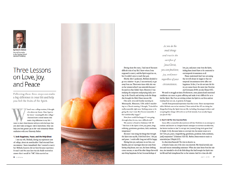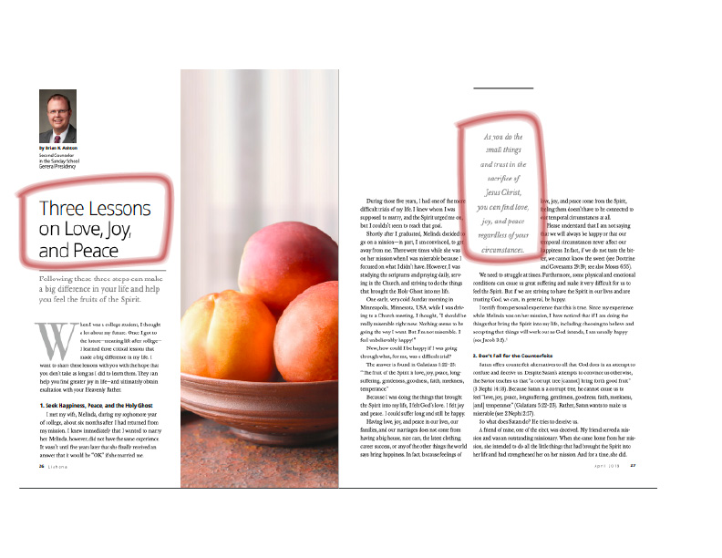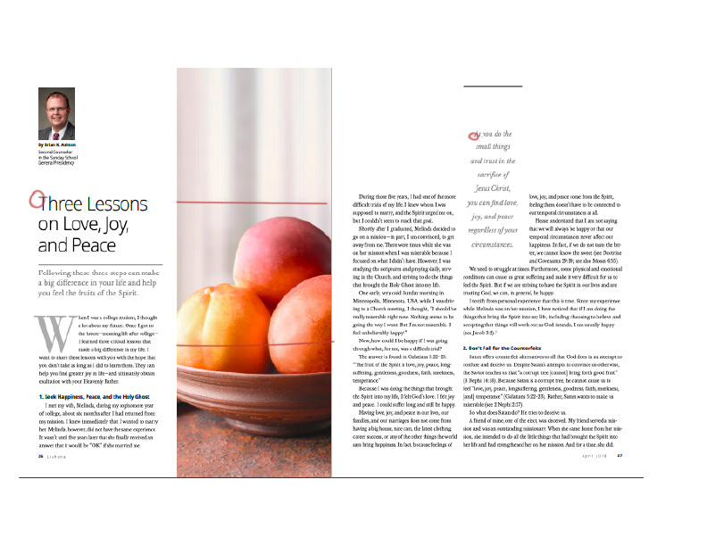 This magazine spread comes from the April 2019 Liahona magazine. The specific photograph did not have any attribution in the magazine, but it assumed that the image is owned by the Church of Jesus Christ of Latter-day Saints, to whom the magazine also belongs.